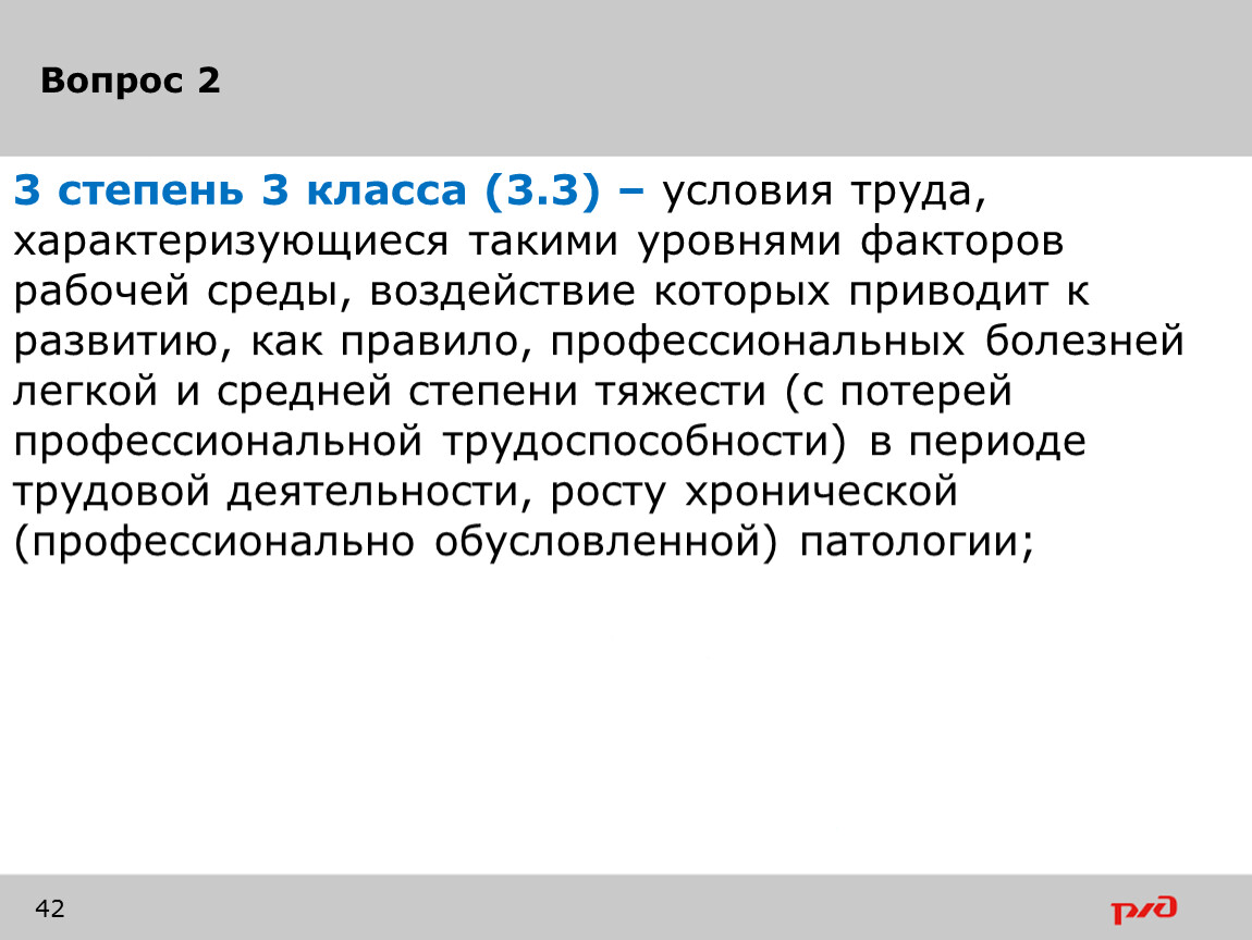 3 степень 3 класса (3.3) – условия труда, характеризующиеся такими уровнями факторов рабочей среды, воздействие которых приводит к развитию, как правило, профессиональных болезней легкой и средней степени тяжести (с потерей профессиональной трудоспособности) в периоде трудовой деятельности, росту хронической (профессионально обусловленной) патологии;