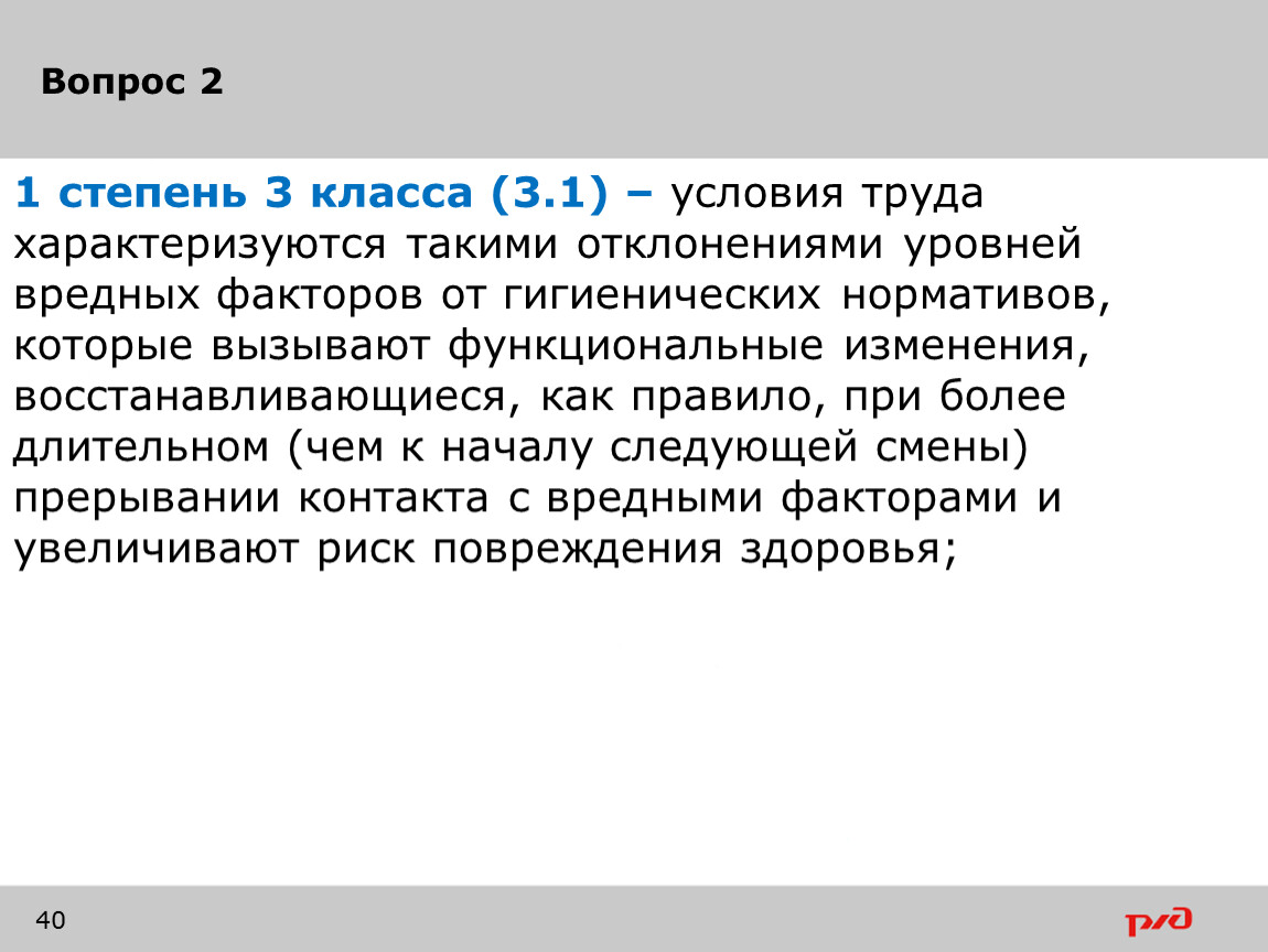 1 степень 3 класса (3.1) – условия труда характеризуются такими отклонениями уровней вредных факторов от гигиенических нормативов, которые вызывают функциональные изменения, восстанавливающиеся, как правило, при более длительном (чем к началу следующей смены) прерывании контакта с вредными факторами и увеличивают риск повреждения здоровья;