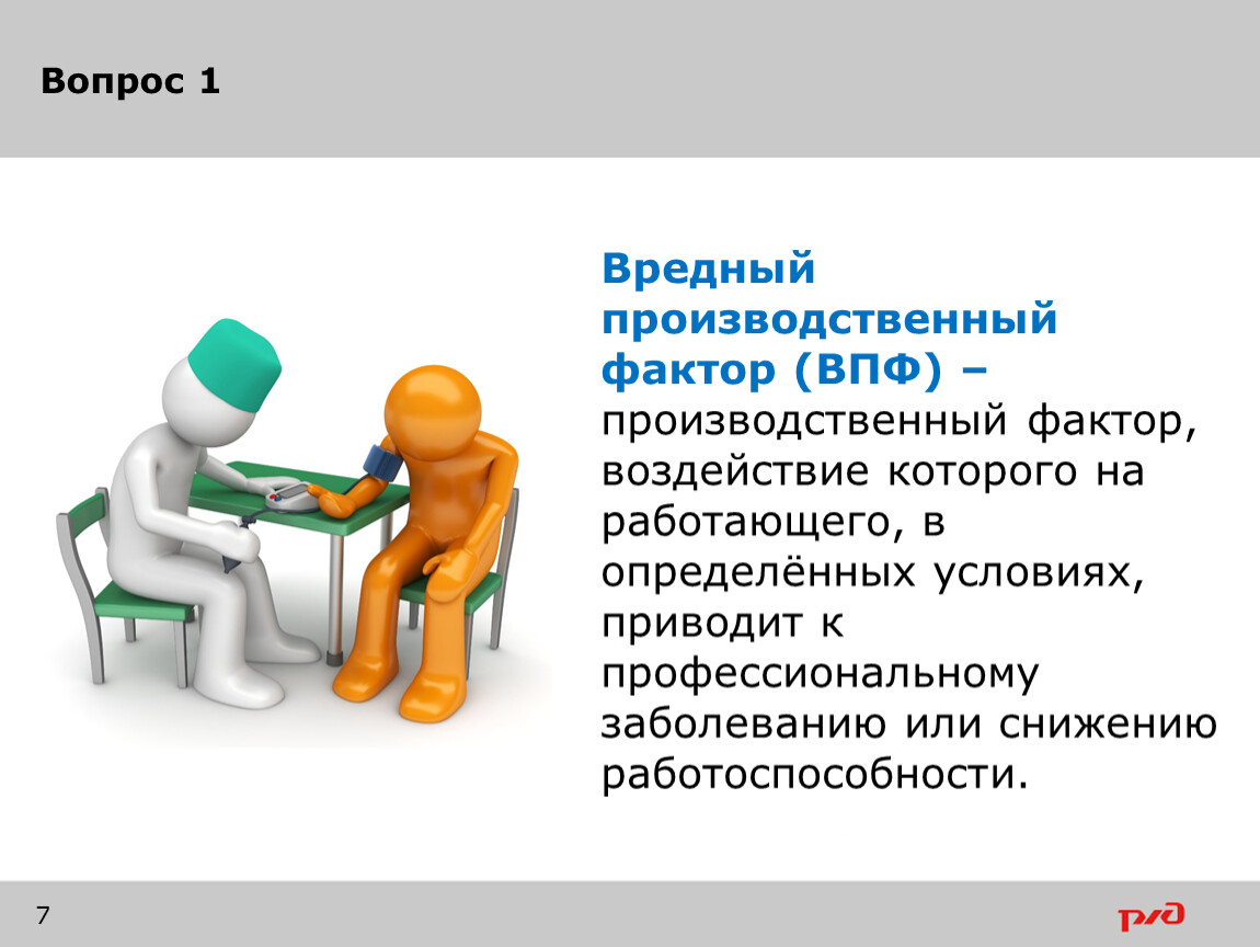 Вредный производственный фактор (ВПФ) – производственный фактор, воздействие которого на работающего, в определённых условиях, приводит к профессиональному заболеванию или снижению работоспособности.
