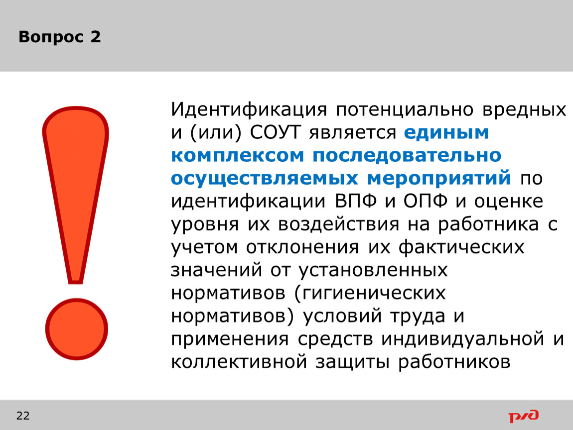 Идентификация потенциально вредных и (или) СОУТ является единым комплексом последовательно осуществляемых мероприятий по идентификации ВПФ и ОПФ и оценке уровня их воздействия на работника с учетом отклонения их фактических значений от установленных нормативов (гигиенических нормативов) условий труда и применения средств индивидуальной и коллективной защиты работников