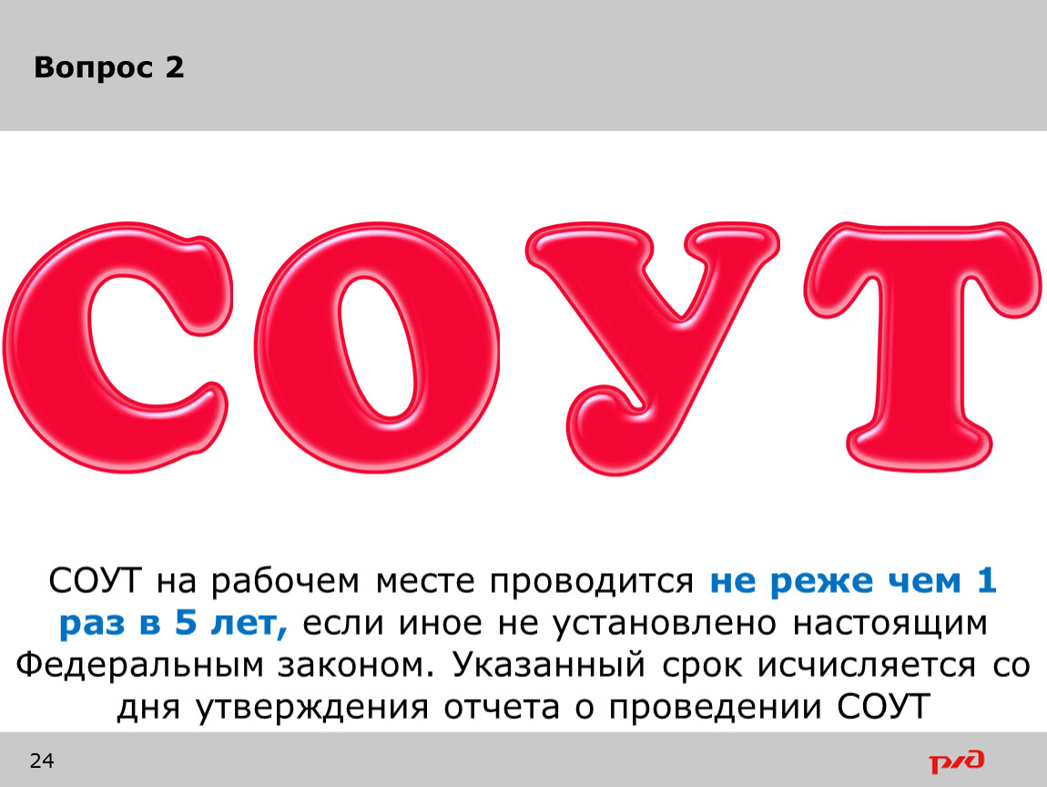 СОУТ на рабочем месте проводится не реже чем 1 раз в 5 лет, если иное не установлено настоящим Федеральным законом. Указанный срок исчисляется со дня утверждения отчета о проведении СОУТ