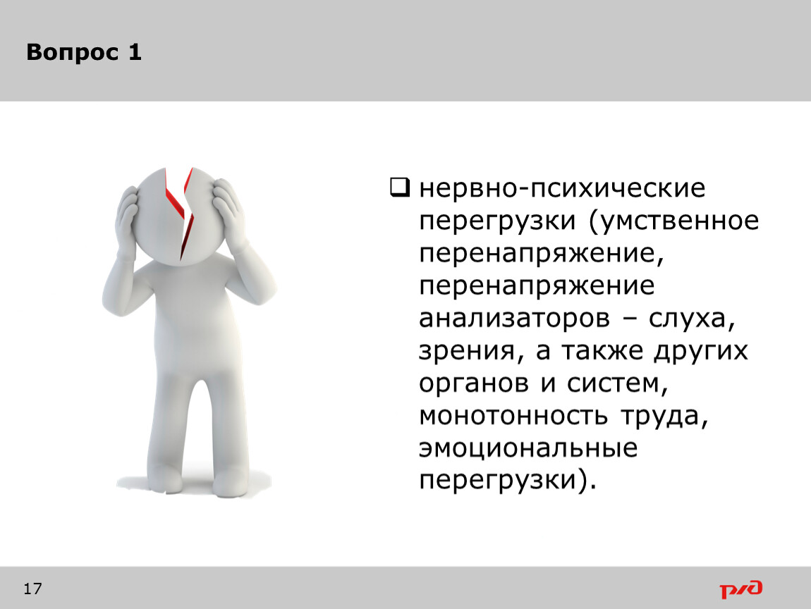 нервно-психические перегрузки (умственное перенапряжение, перенапряжение анализаторов – слуха, зрения, а также других органов и систем, монотонность труда, эмоциональные перегрузки).