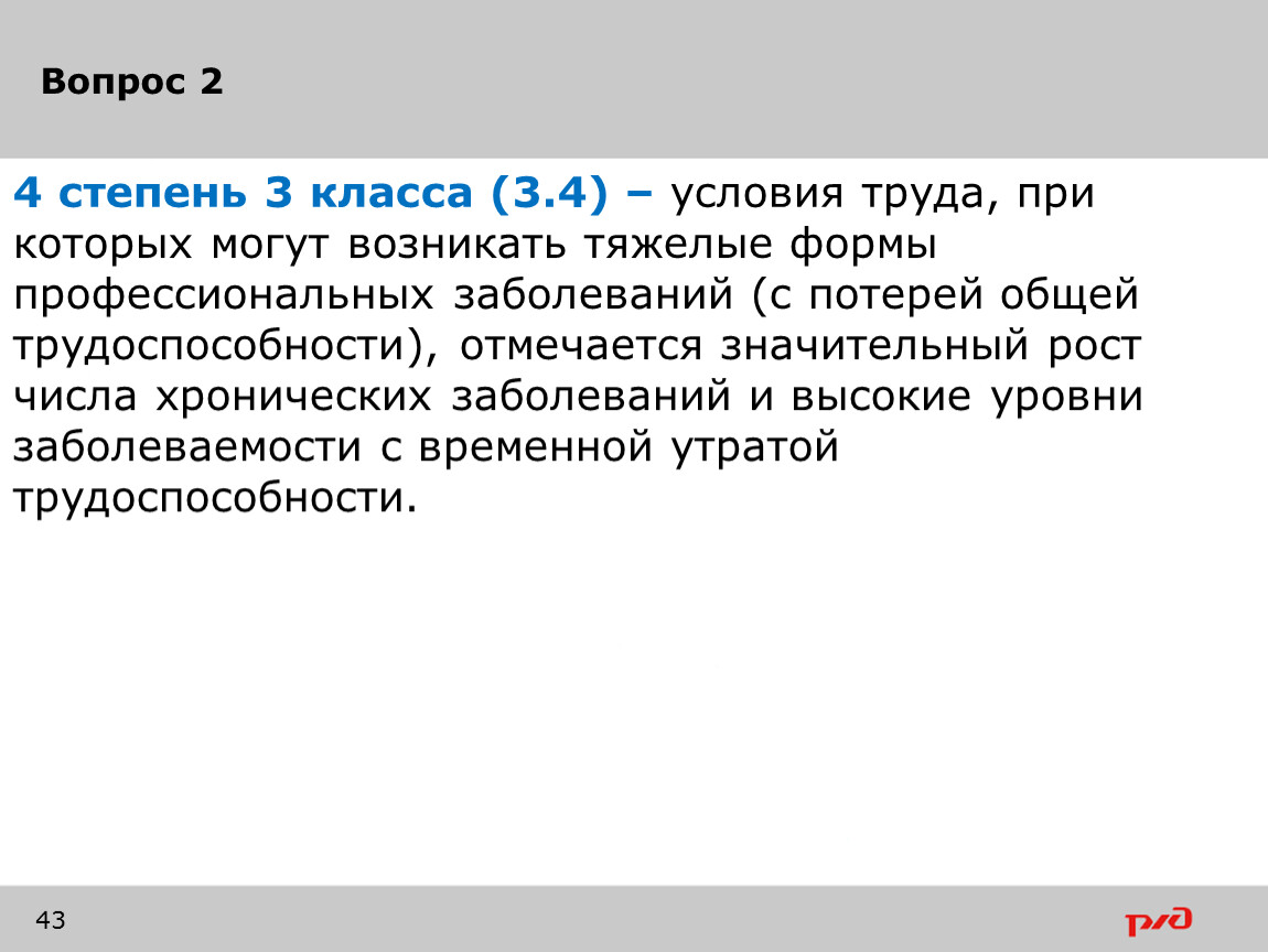 4 степень 3 класса (3.4) – условия труда, при которых могут возникать тяжелые формы профессиональных заболеваний (с потерей общей трудоспособности), отмечается значительный рост числа хронических заболеваний и высокие уровни заболеваемости с временной утратой трудоспособности.