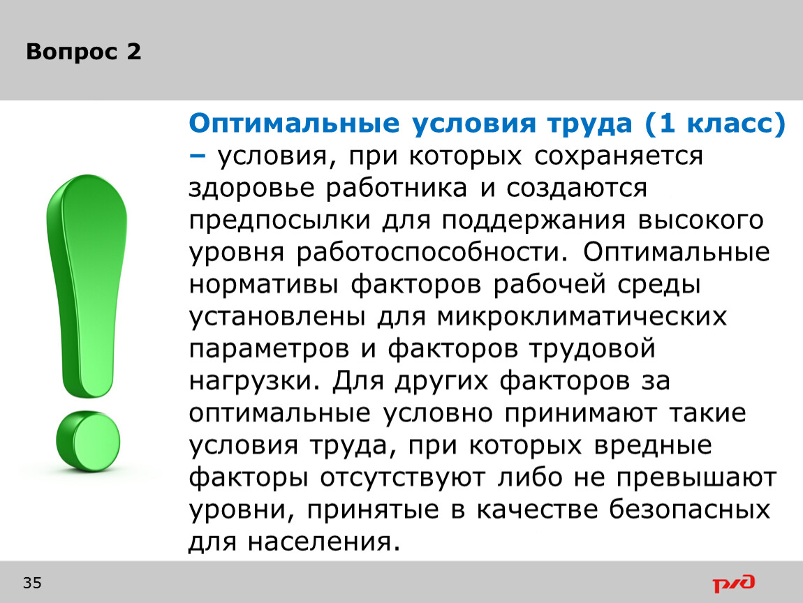 Оптимальные условия труда (1 класс) – условия, при которых сохраняется здоровье работника и создаются предпосылки для поддержания высокого уровня работоспособности. Оптимальные нормативы факторов рабочей среды установлены для микроклиматических параметров и факторов трудовой нагрузки. Для других факторов за оптимальные условно принимают такие условия труда, при которых вредные факторы отсутствуют либо не превышают уровни, принятые в качестве безопасных для населения.