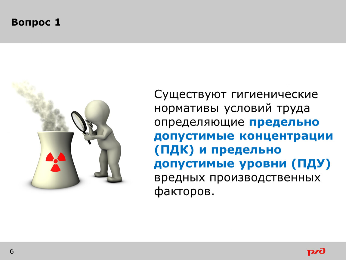 Существуют гигиенические нормативы условий труда определяющие предельно допустимые концентрации (ПДК) и предельно допустимые уровни (ПДУ) вредных производственных факторов.