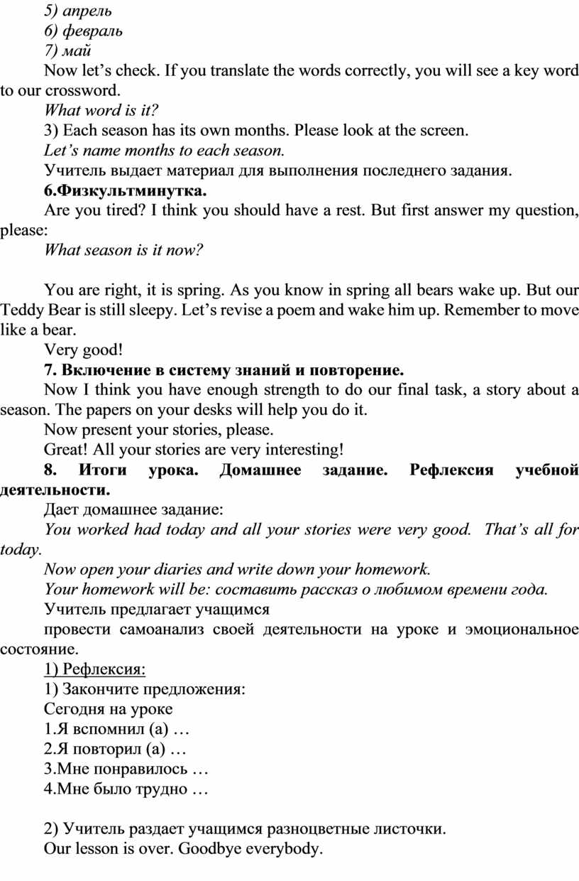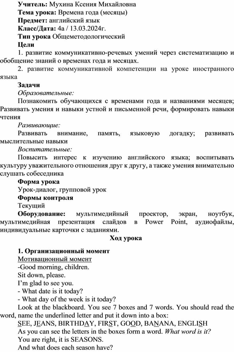 Познакомить обучающихся с временами года и названиями месяцев; Развивать умения и навыки устной и письменной речи, формировать навыки чтения