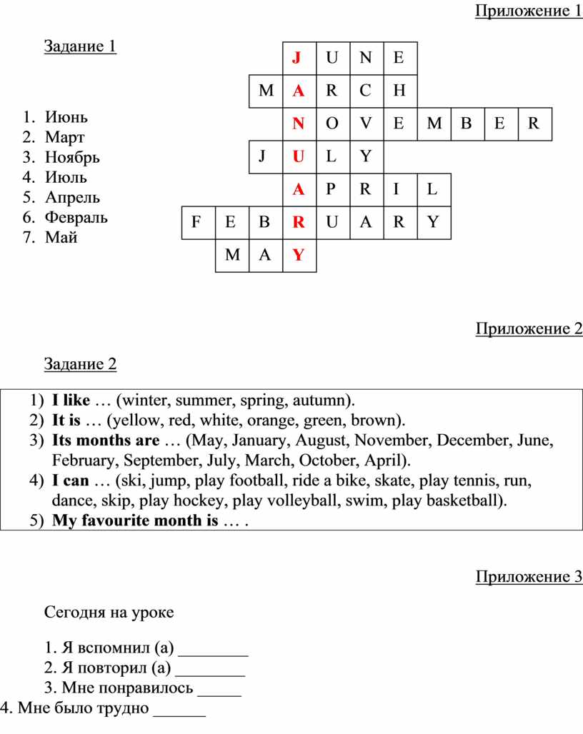 1) I like … (winter, summer, spring, autumn). 2) It is … (yellow, red, white, orange, green, brown). 3) Its months are … (May, January, August, November, December, June, February, September, July, March, October, April). 4) I can … (ski, jump, play football, ride a bike, skate, play tennis, run, dance, skip, play hockey, play volleyball, swim, play basketball). 5) My favourite month is … . |