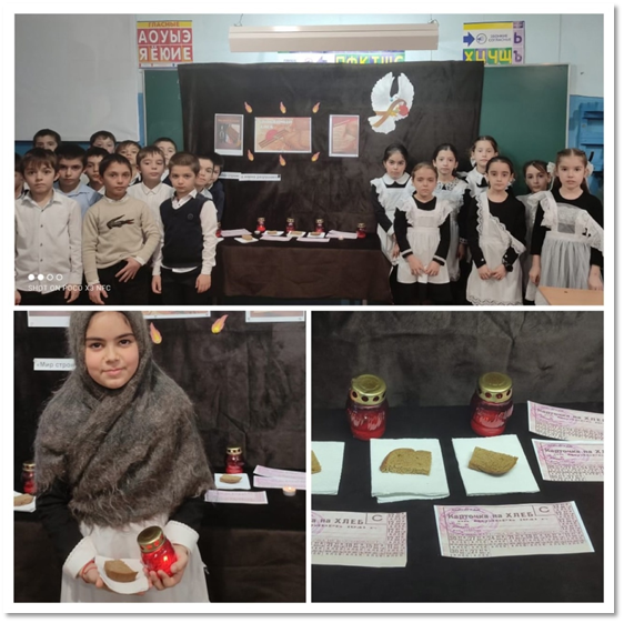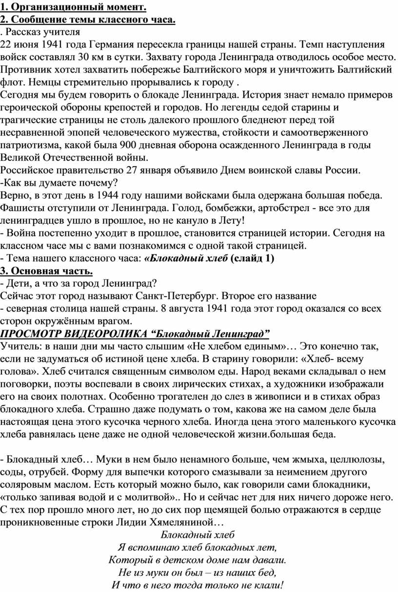 Учитель: в наши дни мы часто слышим «Не хлебом единым»… Это конечно так, если не задуматься об истиной цене хлеба. В старину говорили: «Хлеб- всему голова». Хлеб считался священным символом еды. Народ веками складывал о нем поговорки, поэты воспевали в своих лирических стихах, а художники изображали его на своих полотнах. Особенно трогателен до слез в живописи и в стихах образ блокадного хлеба. Страшно даже подумать о том, какова же на самом деле была настоящая цена этого кусочка черного хлеба. Иногда цена этого маленького кусочка хлеба равнялась цене даже не одной человеческой жизни.большая беда.