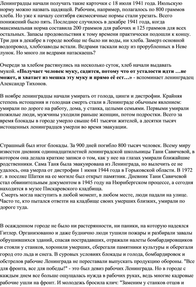 Страшный был итог блокады. За 900 дней погибло 800 тысяч человек. Всему миру известен дневник одиннадцатилетней ленинградской школьницы Тани Савичевой, в котором она делала краткие записи о том, как у нее на глазах умирали ближайшие родственники. Сама Таня была эвакуирована из Ленинграда, но вылечить ее не удалось, она умерла от дистрофии 1 июня 1944 года в Горьковской области. В 1972 г. в поселке Шатки на ее могиле был открыт памятник. Дневник Тани Савичевой стал обвинительным документом в 1945 году на Нюрнбергском процессе, а сегодня находится в музее Пискаревского кладбища.