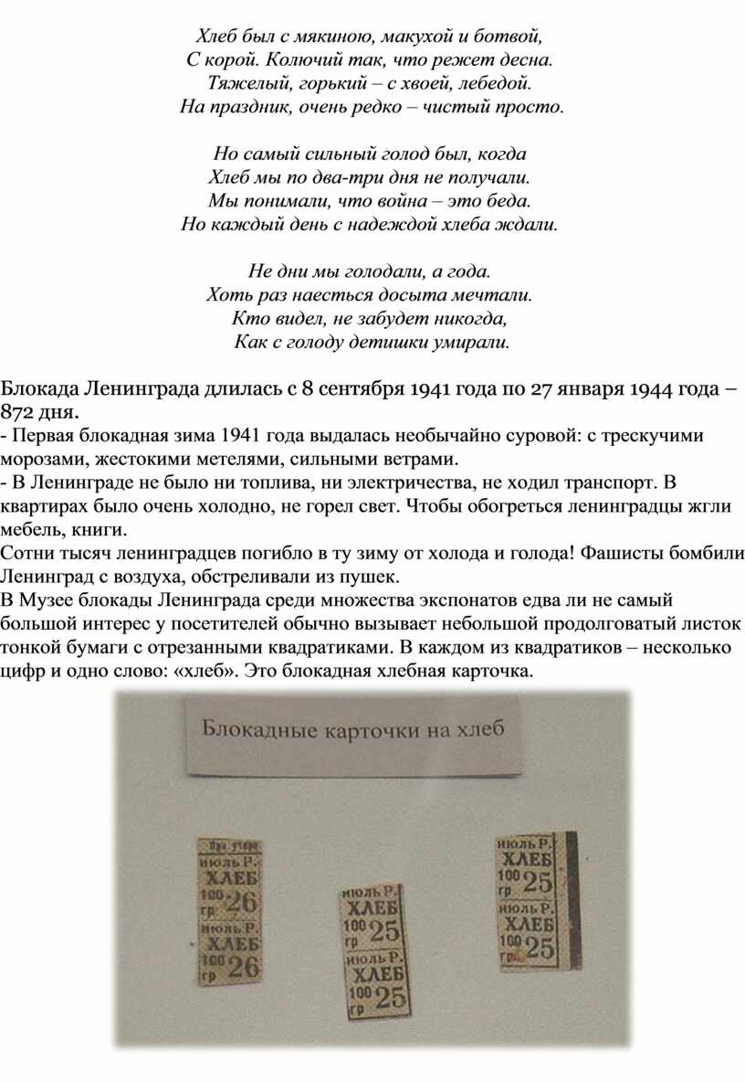 В Музее блокады Ленинграда среди множества экспонатов едва ли не самый большой интерес у посетителей обычно вызывает небольшой продолговатый листок тонкой бумаги с отрезанными квадратиками. В каждом из квадратиков – несколько цифр и одно слово: «хлеб». Это блокадная хлебная карточка.