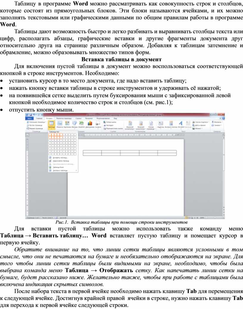 · на появившейся сетке выделить путем буксирования мыши с зафиксированной левой кнопкой необходимое количество строк и столбцов (см. рис.1);