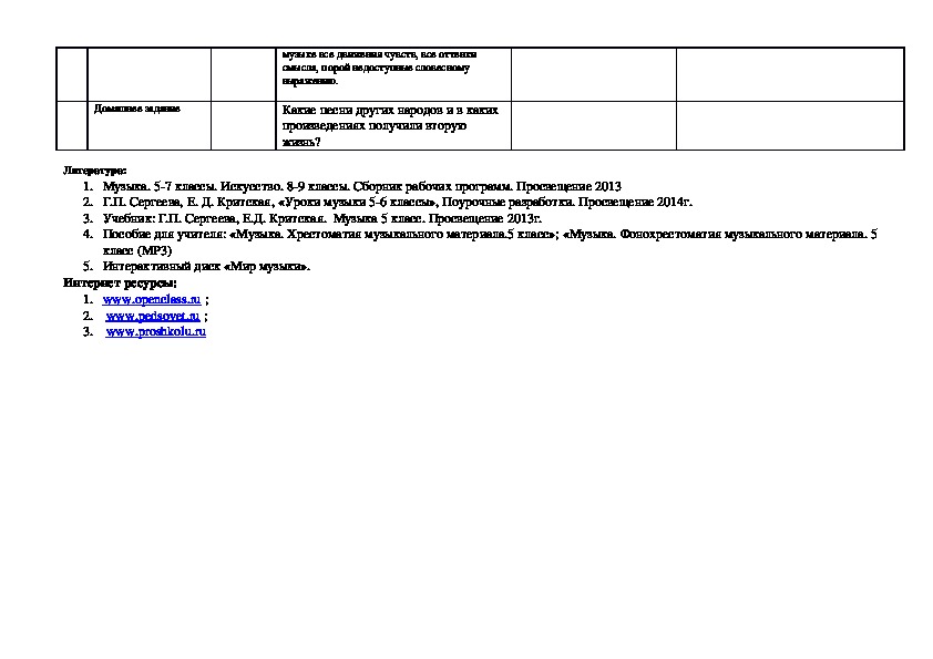 2. Г.П. Сергеева, Е. Д. Критская, «Уроки музыки 56 классы», Поурочные разработки. Просвещение 2014г.