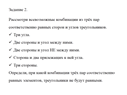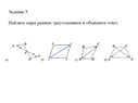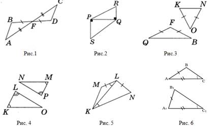 Начните урок с выполнения задания 1 (слайд 2). Оно направлено на понимание того, что для установления равенства двух треугольников недостаточно знать одну или две пары равных элементов (сторон и углов) треугольника. Также показывает, что не любые три пары равных элементов устанавливают равенство двух треугольников, например, рисунок. 4.