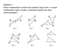 Задание 1. Укажи номера рисунков, на которых изображены равные треугольники. Объясни свой выбор. Для равенства двух треугольников достаточно ли равенство a) одной пары элементов (сторон и углов)? Объясни свой ответ, используя рисунки 2, 3, 4, 5, 6. b) двух пар элементов этих треугольников? Объясни свой ответ, используя рисунки 2, 3, 4, 5, 6. c) трёх пар элементов? Объясни свой ответ, используя рисунок 4, 6.
