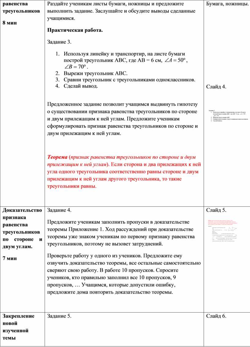 Задание 4. Предложите ученикам заполнить пропуски в доказательстве теоремы Приложение 1. Ход рассуждений при доказательстве теоремы уже знаком ученикам по первому признаку равенства треугольников, поэтому не вызовет затруднений. Проверьте работу у одного из учеников. Предложите ему озвучить доказательство теоремы, все остальные самостоятельно сверяют свою работу. В работе 10 пропусков. Спросите учеников, кто правильно заполнил все 10 пропусков, 9 пропусков, … Учащимся, которые допустили ошибку, предложите дома повторить доказательство теоремы.