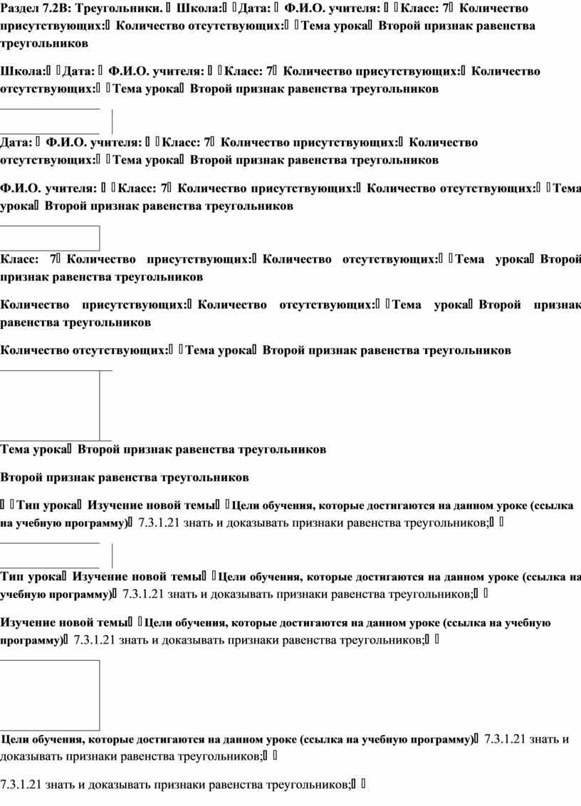 - Понимать какое наименьшее количество равных пар углов и сторон необходимо знать, чтобы установить равенство двух треугольников. - Знать и доказывать второй признак равенства треугольников. - Формировать навыки доказательных рассуждений с помощью аксиом и теорем. - Применять второй признак равенства треугольников при решении задач.