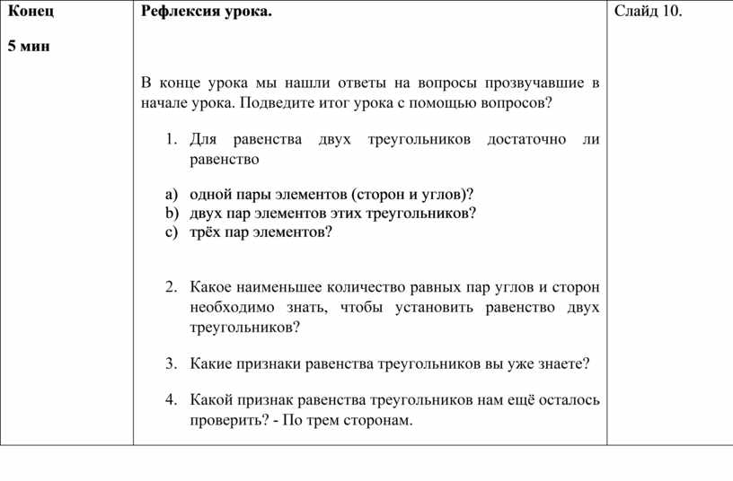 В конце урока мы нашли ответы на вопросы прозвучавшие в начале урока. Подведите итог урока с помощью вопросов? 1. Для равенства двух треугольников достаточно ли равенство a) одной пары элементов (сторон и углов)? b) двух пар элементов этих треугольников? c) трёх пар элементов?
