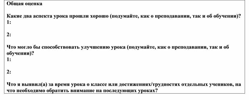 Какие два аспекта урока прошли хорошо (подумайте, как о преподавании, так и об обучении)? 1: