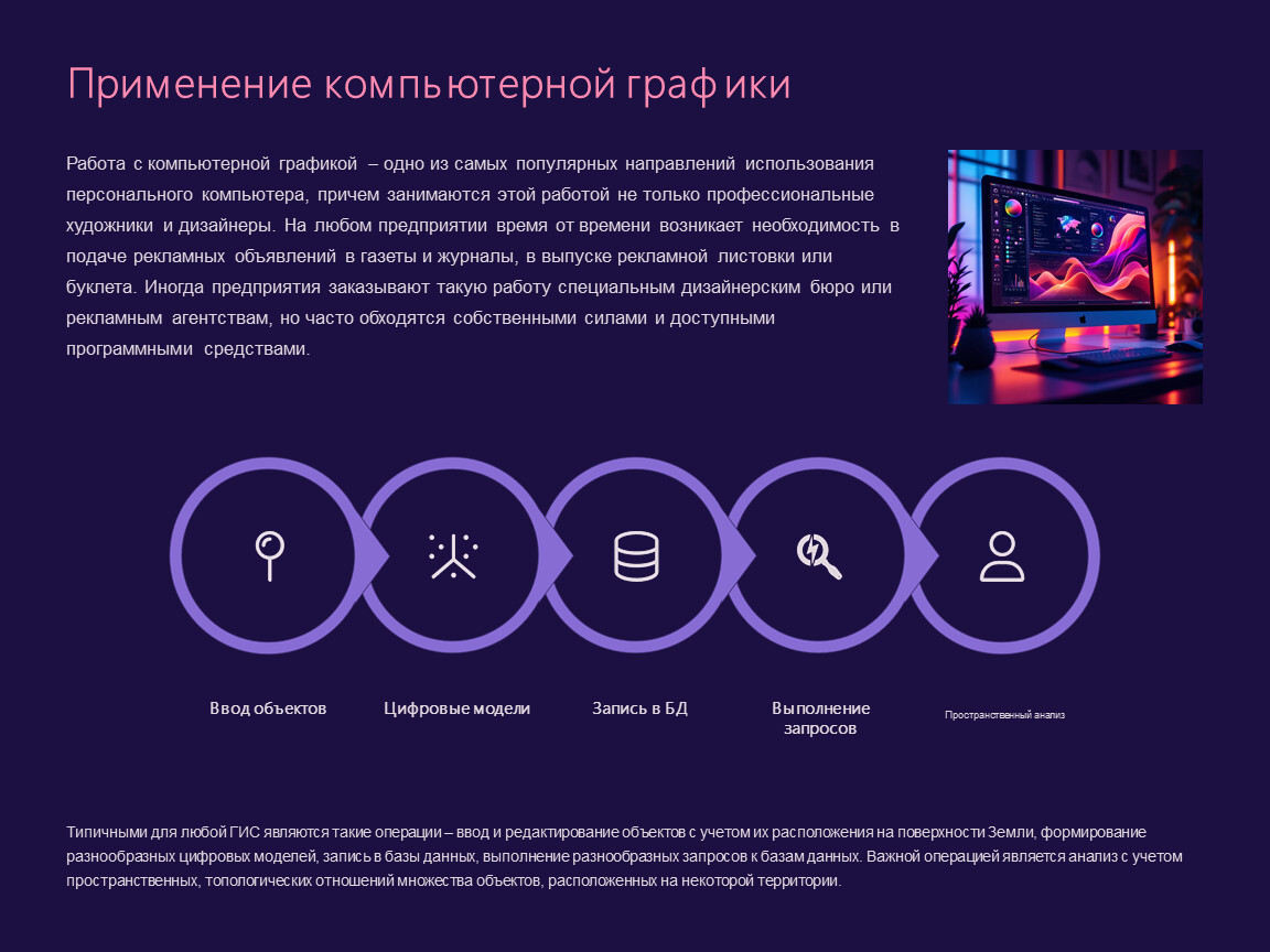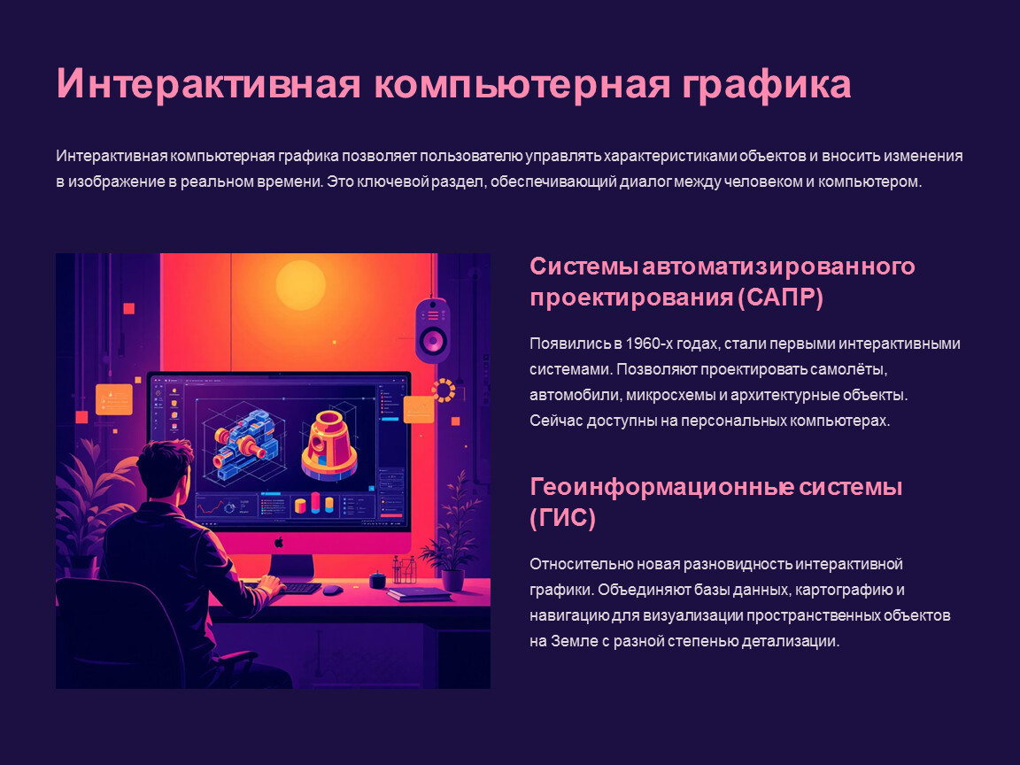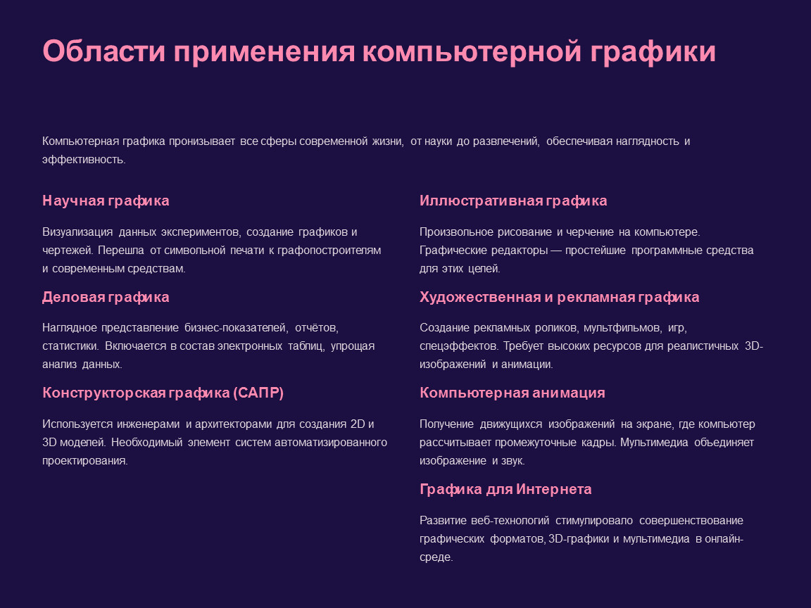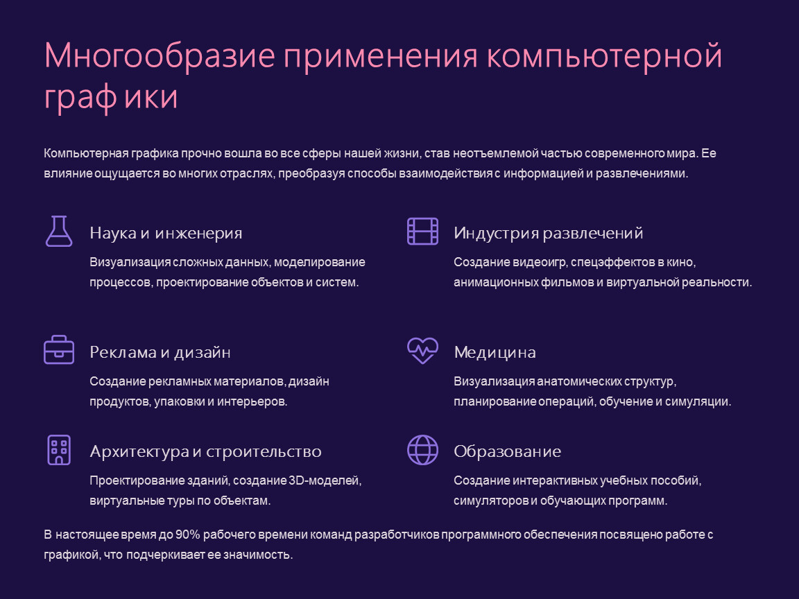 Компьютерная графика пронизывает все сферы современной жизни, от науки до развлечений, обеспечивая наглядность и эффективность.
