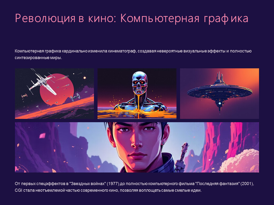 Компьютерная графика кардинально изменила кинематограф, создавая невероятные визуальные эффекты и полностью синтезированные миры.