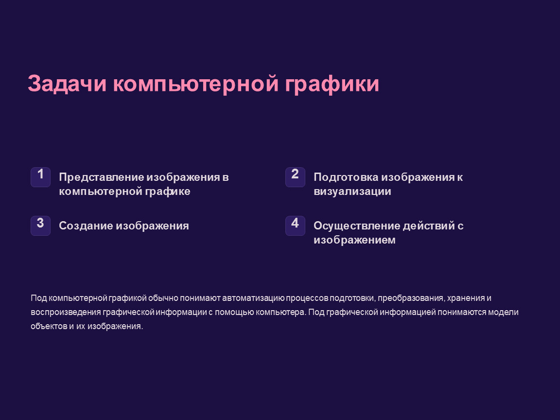 Под компьютерной графикой обычно понимают автоматизацию процессов подготовки, преобразования, хранения и воспроизведения графической информации с помощью компьютера. Под графической информацией понимаются модели объектов и их изображения.