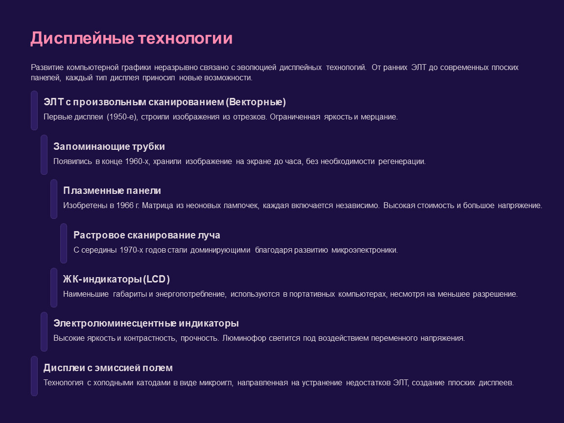 Развитие компьютерной графики неразрывно связано с эволюцией дисплейных технологий. От ранних ЭЛТ до современных плоских панелей, каждый тип дисплея приносил новые возможности.