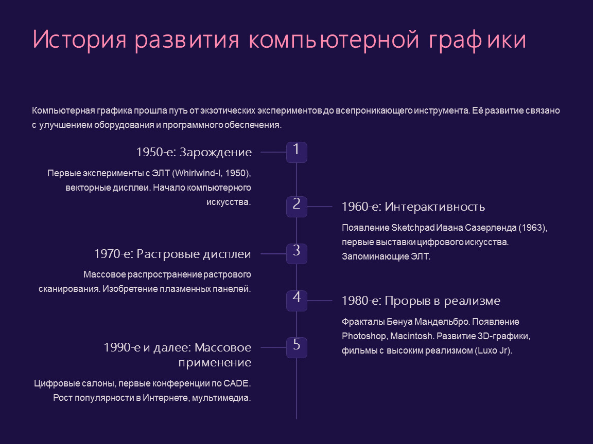 Компьютерная графика прошла путь от экзотических экспериментов до всепроникающего инструмента. Её развитие связано с улучшением оборудования и программного обеспечения.