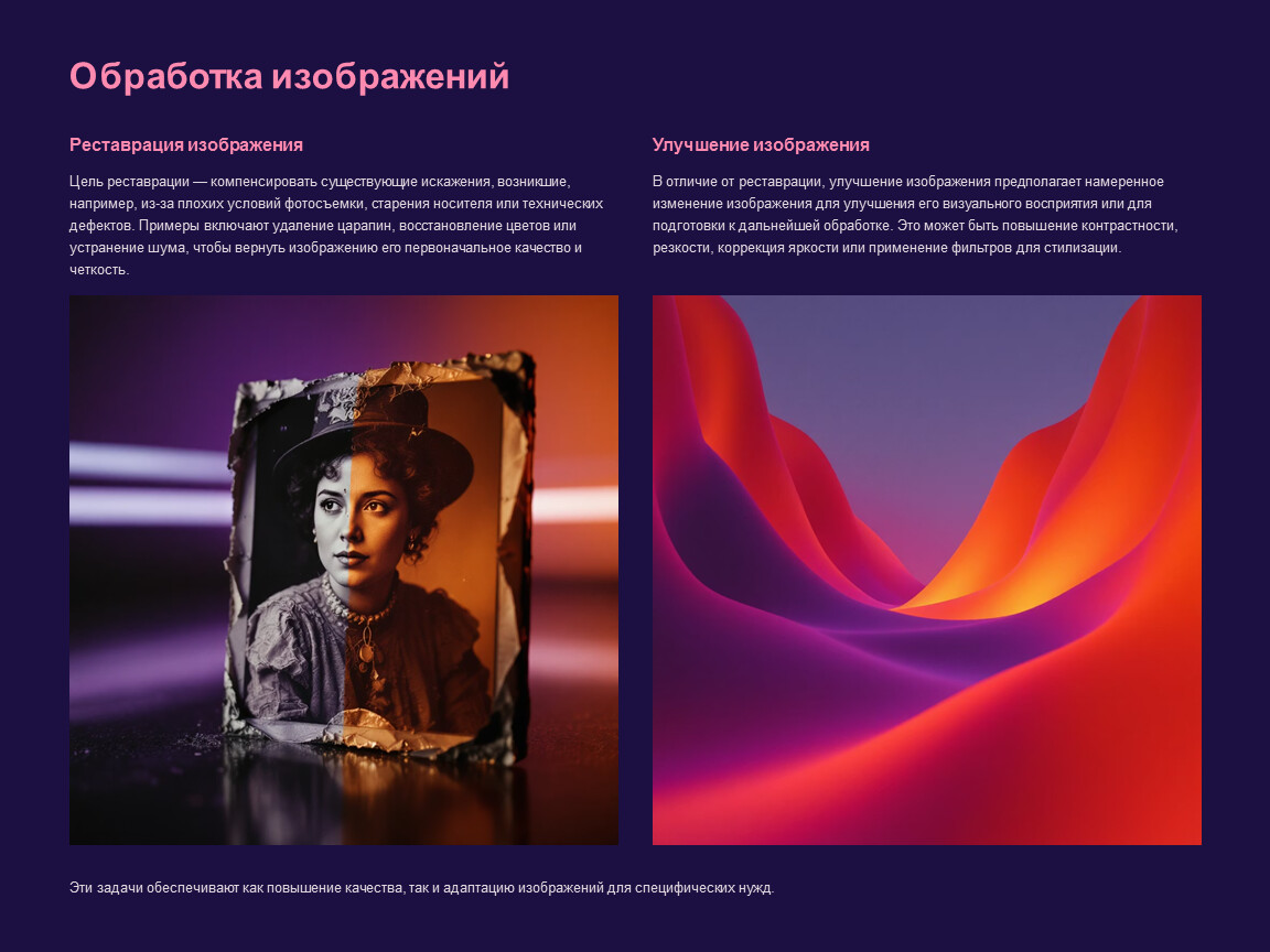 Эти задачи обеспечивают как повышение качества, так и адаптацию изображений для специфических нужд.