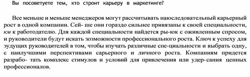 Все меньше и меньше менеджеров могут рассчитывать на юследовательный карьерный рост в одной компании. Сей ше они гораздо сильнее привязаны к своей специальности, км к работодателю. Для каждой специальности найдется ры- юк с оживленным спросом, и руководители будут искать зозможности профессионального роста. Ключ к успеху для эудущих руководителей в том, чтобы изучать различные спе циальности и выбрать одну, с наилучшими перспективами сарьерного и личного роста. Компаниям придется разрабо тать комплекс стимулов и условий для привлечения или удер- сания ценных профессионалов.