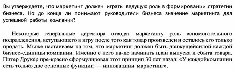 Некоторые генеральные директора отводят маркетингу роль вспомогательного подразделения, вступающего в игру после того как товар произведен и осталось его только продать. Мы же настаиваем на том, что маркетинг должен быть движущей силой каждой бизнес-единицы компании. Именно с него на до начинать план выпуска и сбыта товара. Питер Друкер пре красно сформулировал этот принцип 30 лет назад: «У каждой компании есть только две основные функции — инновации и маркетинг».