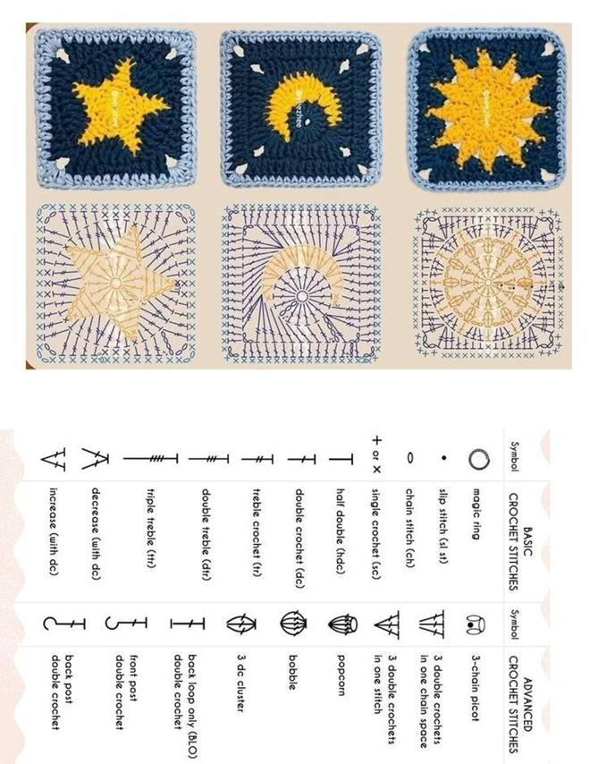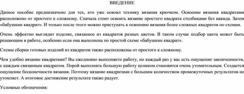 Данное пособие предназначено для тех, кто уже освоил технику вязания крючком. Освоение вязания квадратами расположено от простого к сложному. Сначала стоит освоить вязание простого квадрата столбиками без накида. Затем «бабушкин квадрат». И только после этого можно приступать к освоению вязания более сложных квадратов по схемам.