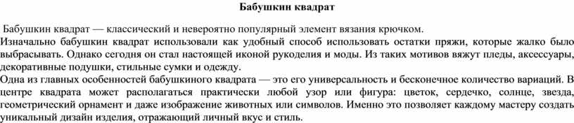 Одна из главных особенностей бабушкиного квадрата — это его универсальность и бесконечное количество вариаций. В центре квадрата может располагаться практически любой узор или фигура: цветок, сердечко, солнце, звезда, геометрический орнамент и даже изображение животных или символов. Именно это позволяет каждому мастеру создать уникальный дизайн изделия, отражающий личный вкус и стиль.