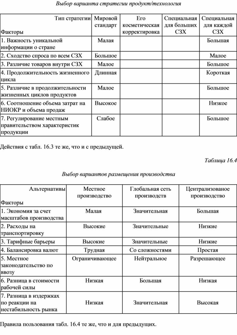 Выбор оптимальной формы интернационализации зависит от значительного числа факторов, определяющих стратегию фирмы по выбору продукта, технологии его изготовления, маркетингу, размещению производства. Поэтому предварительно должны быть выбраны варианты стратегии маркетинга, продукта/технологии и размещения производства. Этой цели служат вспомогательные таблицы 16.2, 16.3, 16.4.