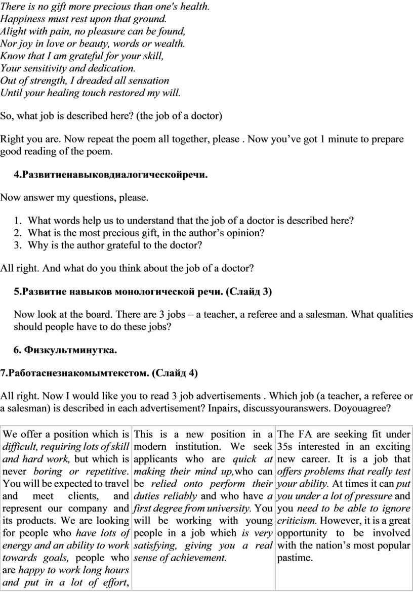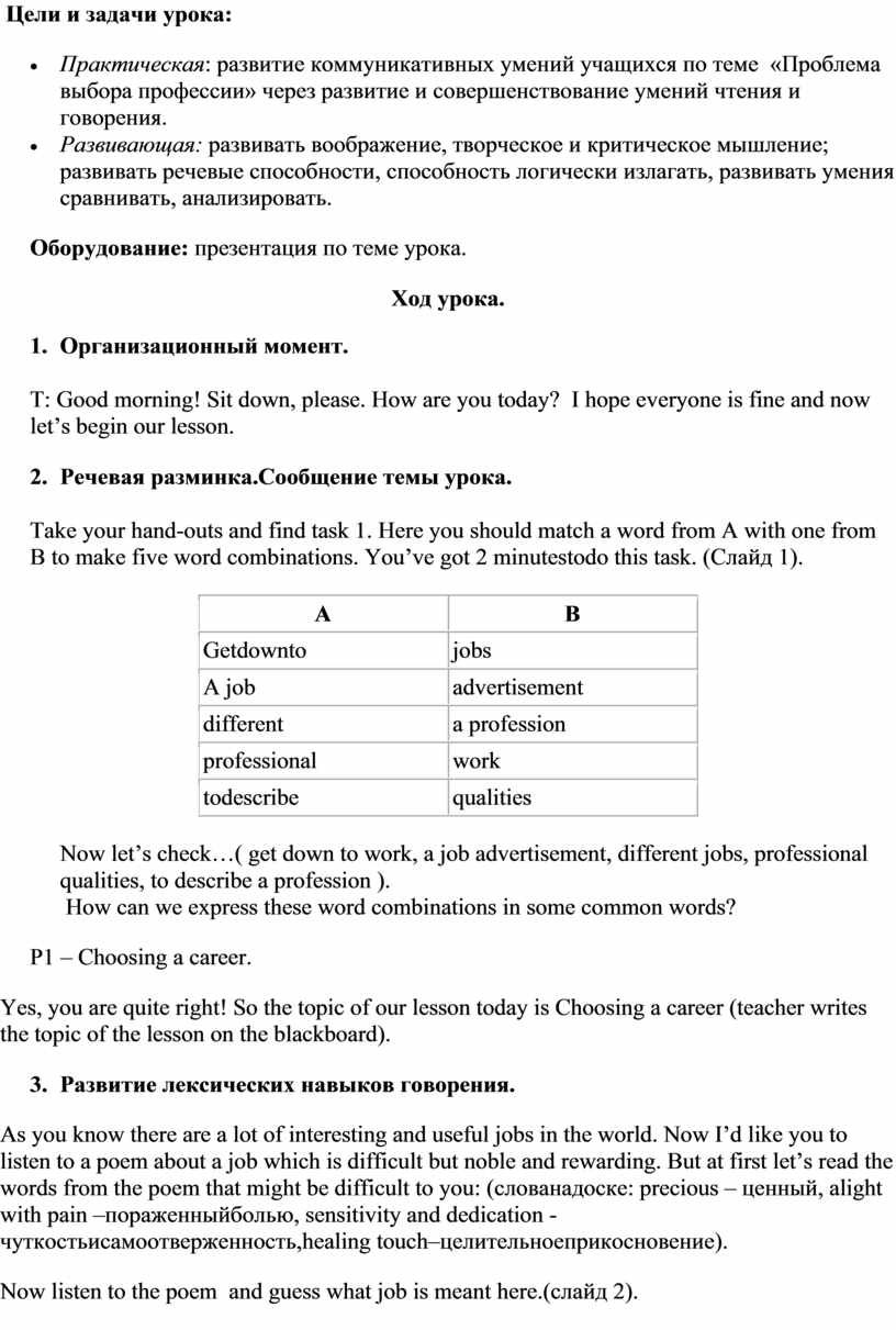 As you know there are a lot of interesting and useful jobs in the world. Now I’d like you to listen to a poem about a job which is difficult but noble and rewarding. But at first let’s read the words from the poem that might be difficult to you: (слованадоске: precious – ценный, alight with pain –пораженныйболью, sensitivity and dedication -чуткостьисамоотверженность,healing touch–целительноеприкосновение).