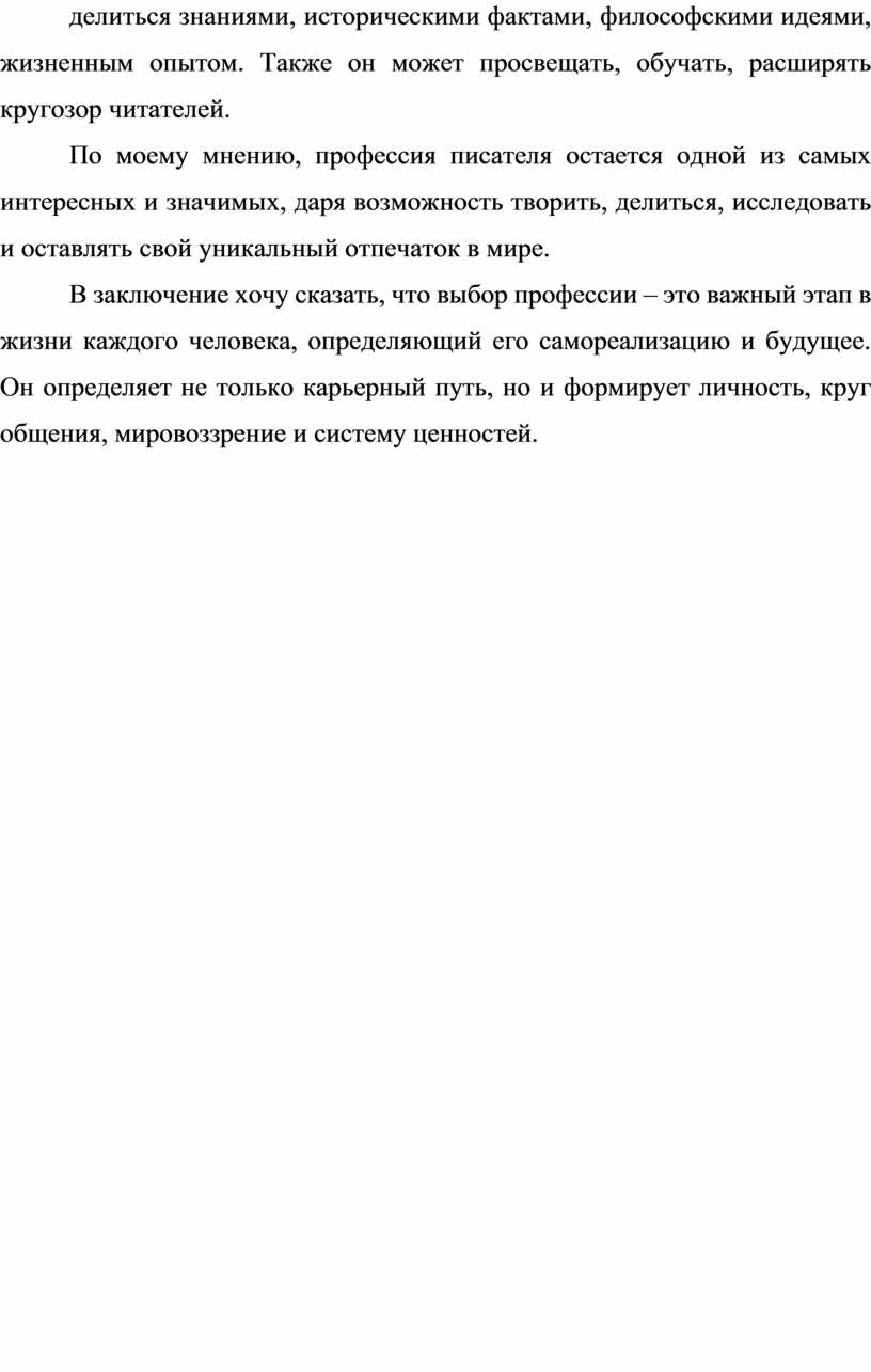 В заключение хочу сказать, что выбор профессии – это важный этап в жизни каждого человека, определяющий его самореализацию и будущее. Он определяет не только карьерный путь, но и формирует личность, круг общения, мировоззрение и систему ценностей.