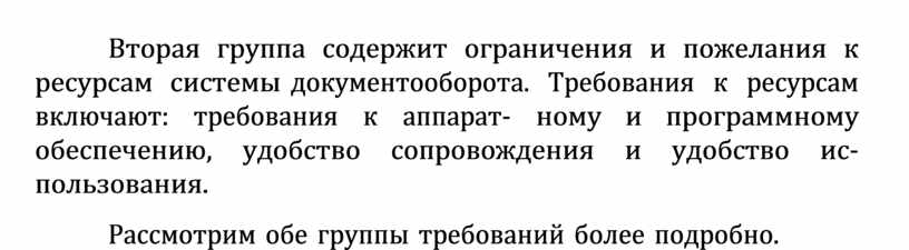 Вторая группа содержит ограничения и пожелания к ресурсам системы документооборота. Требования к ресурсам включают: требования к аппарат- ному и программному обеспечению, удобство сопровождения и удобство ис- пользования.