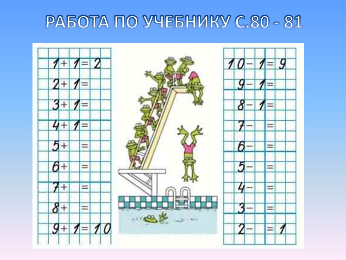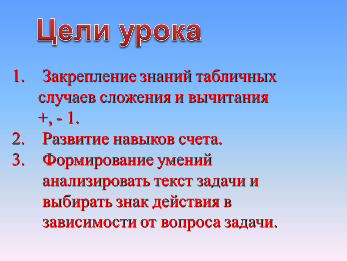 1. Закрепление знаний табличных случаев сложения и вычитания +, - 1.2. Развитие навыков счета. 3. Формирование умений анализировать текст задачи и выбирать знак действия в зависимости от вопроса задачи.