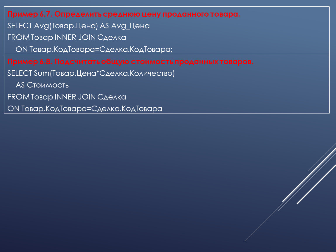 Пример 6.8. Подсчитать общую стоимость проданных товаров.