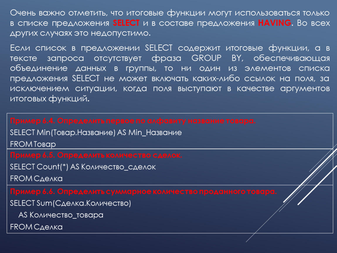 Очень важно отметить, что итоговые функции могут использоваться только в списке предложения SELECT и в составе предложения HAVING. Во всех других случаях это недопустимо.
