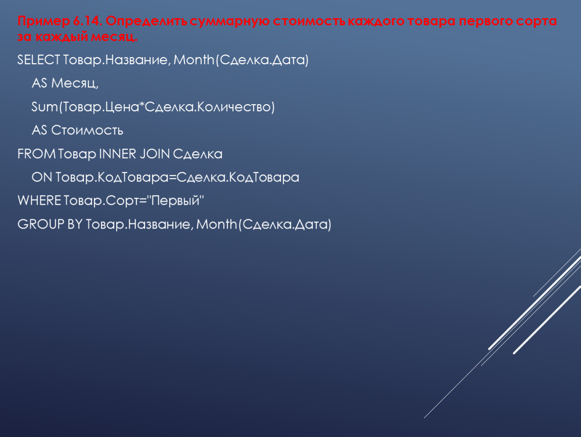 Пример 6.14. Определить суммарную стоимость каждого товара первого сорта за каждый месяц.
