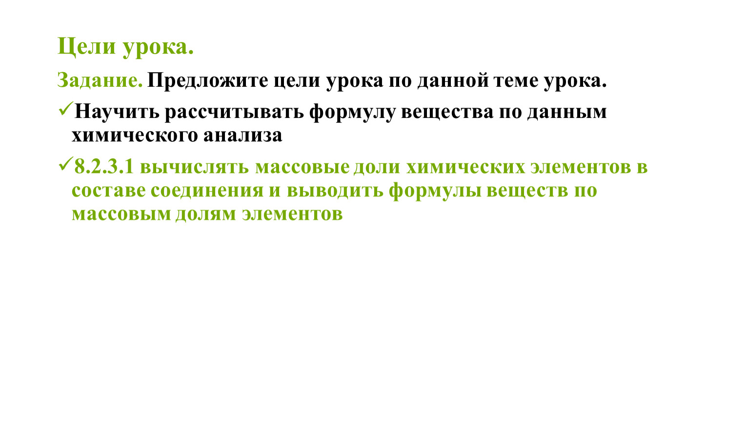 8.2.3.1 вычислять массовые доли химических элементов в составе соединения и выводить формулы веществ по массовым долям элементов