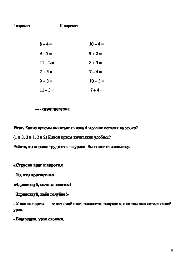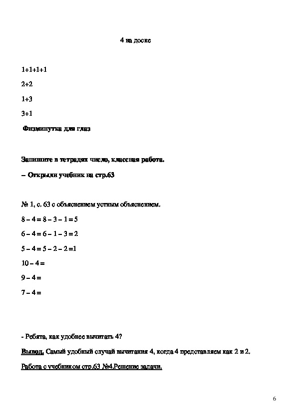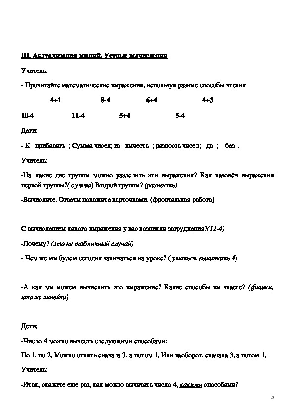 - Осознание практической важности изучаемого способа вычитания числа 4.