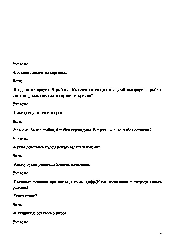 Условие: было 9 рыбок, 4 рыбки пересадили. Вопрос: сколько рыбок осталось?