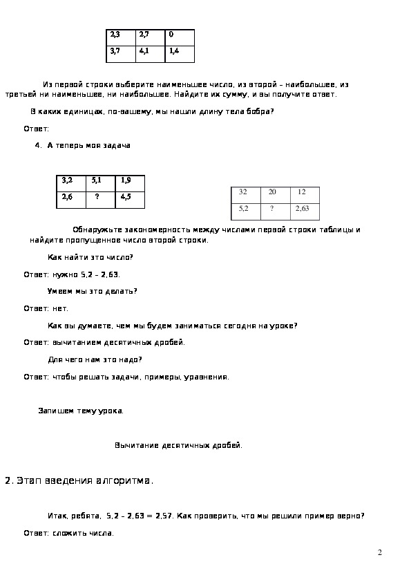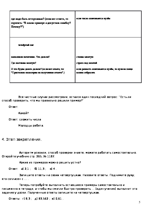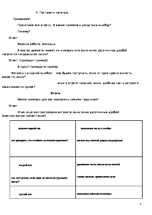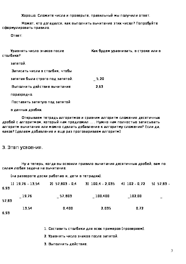 1. Составить и выучить с учащимися алгоритм вычитания десятичных дробей,