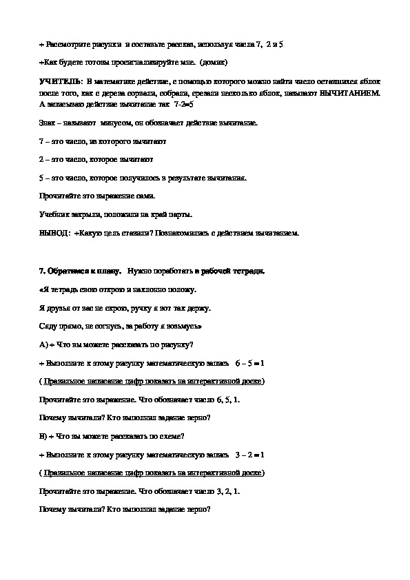 «Вычитание». Он служит началом знакомства с операцией вычитание. Урок дает возможность