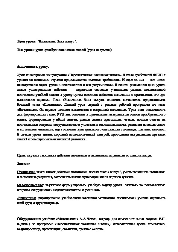 Урок спланирован по программе «Перспективная начальная школа». В свете требований ФГОС к урокам на начальной ступени предъявляются высокие требования. И одно из них — это новое планирование задач урока в соответствии с его результатами. В основе реализации цели урока лежит универсальное действие — первичное освоение учащимися умения коллективной постановки учебной задачи к уроку путем освоения действия вычитания и применения его при выполнении заданий. Тема «Вычитание. Знак минус» является логическим продолжением большой темы «Сложение». Данный урок первый в разделе рабочей программы по теме «Вычитание». Он служит началом знакомства с операцией вычитание. Урок дает возможность для формирования таких УУД как освоение и применение материала на основе приобретенного опыта, формирование учебной задачи, умение давать правильные, четкие, полные ответы на поставленные вопросы, сотрудничество с учителем и одноклассниками, развивает ассоциативное и логическое мышление, идет освоение критериального оценивания с помощью цветных жетонов. В начале урока дается хороший психологический настрой, проводится актуализация прежних знаний с помощью математической разминки.