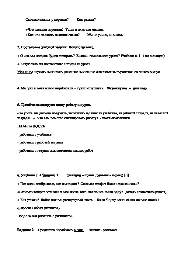 Цель: научить выполнять действие вычитание и записывать выражение со знаком минус.