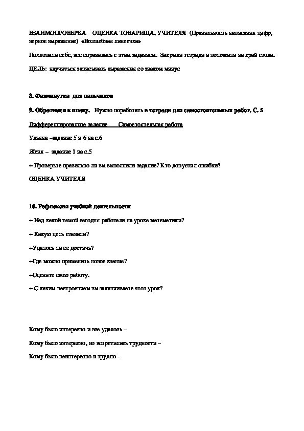 Кому было неинтересно и трудно Анализ урока математики по теме «Вычитание. Знак ()».