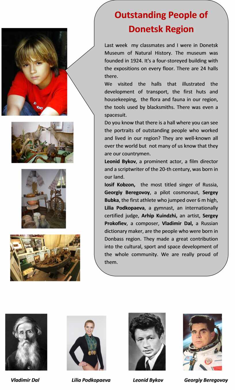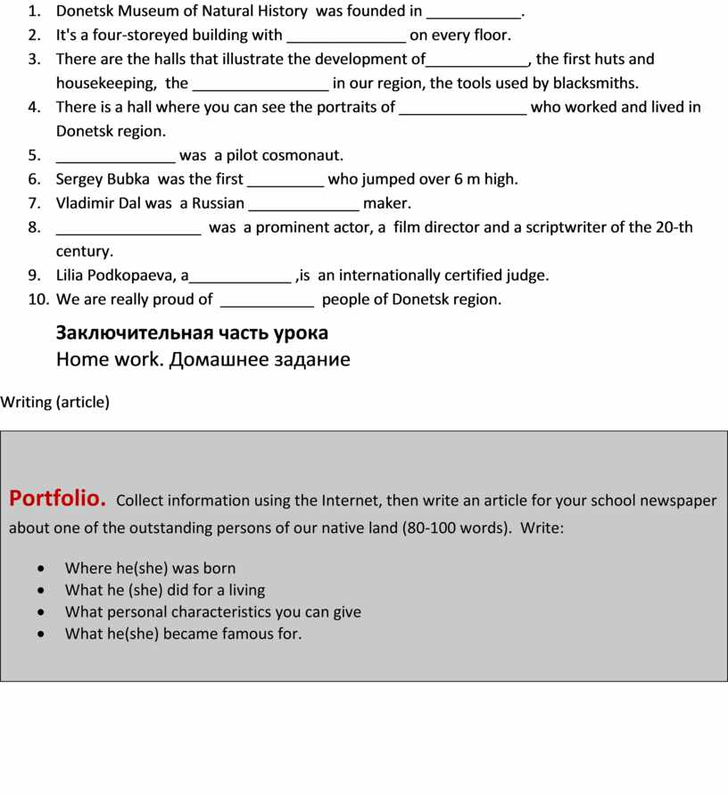 Portfolio. Collect information using the Internet, then write an article for your school newspaper about one of the outstanding persons of our native land (80-100 words). Write: · Where he(she) was born · What he (she) did for a living · What personal characteristics you can give · What he(she) became famous for.