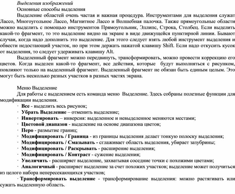 Для работы с выделением есть команда меню Выделение. Здесь собраны полезные функции для модификации выделения.